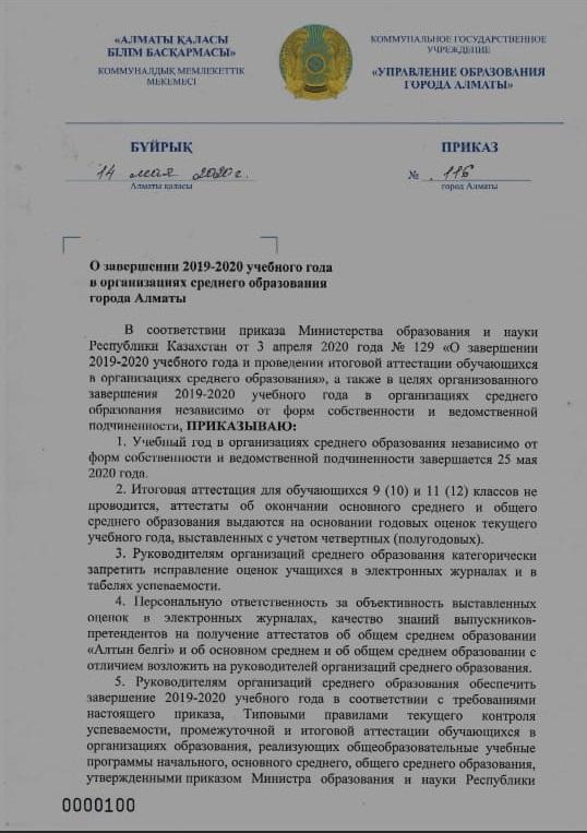 14 мамыр 2020 0 1 2 3 4 5 Приказ № 116 О завершении 2019-2020 учебного года в организациях среднего образования города Алматы